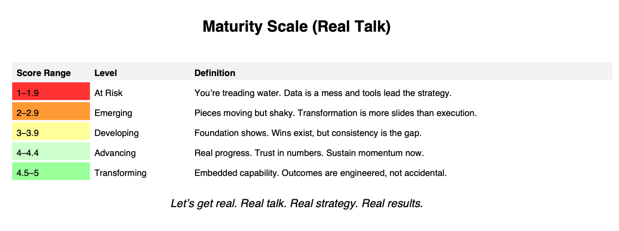 - Use this practical assessment to help you determine your organization’s maturity and readiness level for future transformation!