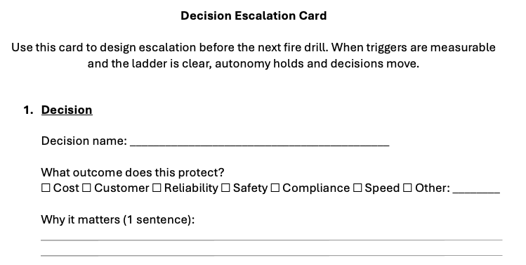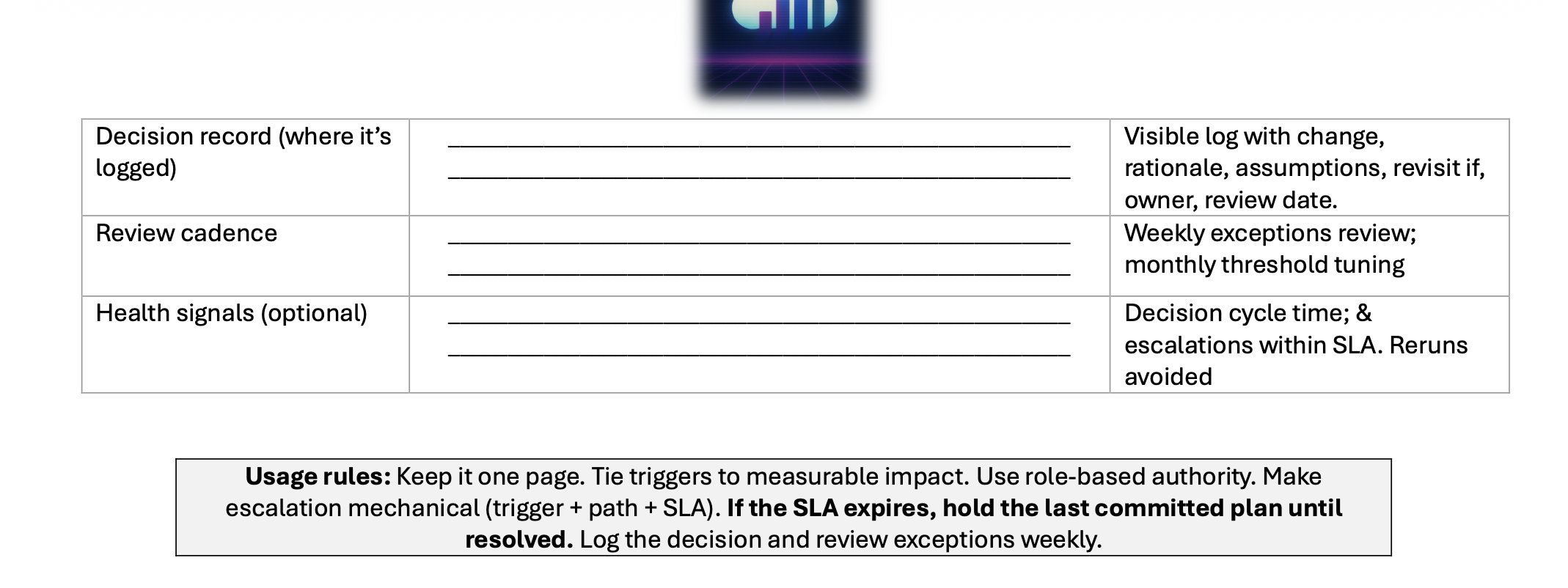A tool to define decision rights, measurable triggers, and escalation paths, so autonomy doesn't drift and decisions don't stall.