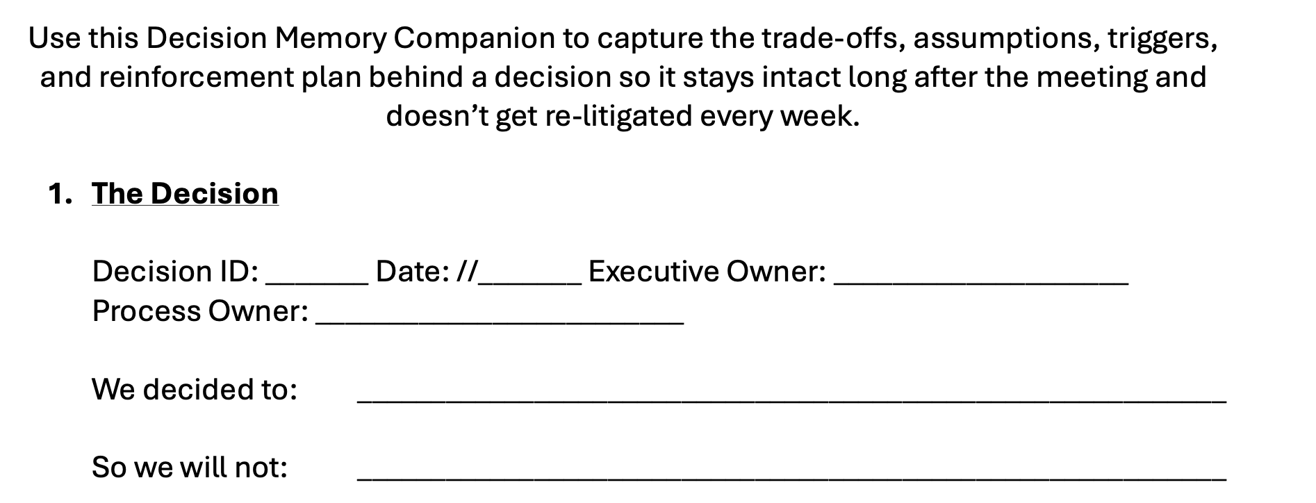 Use this as a companion to reinforce the boundaries defined in your Decision Boundary Cards by capturing the executive intent behind the decision.